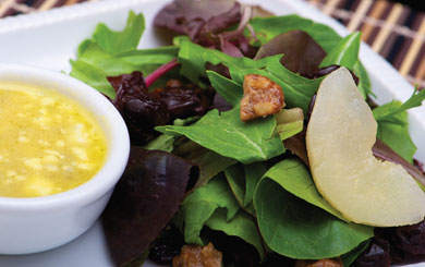 Mix all dressing ingredients together. Layer lettuce, pear pieces, cherries and walnuts on a plate. You can also add grilled chicken. Serve with dressing and french bread.