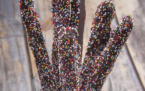 Pour colored sugar on wax or parchment paper. Melt chocolate and pour into a tall glass. Hold onto end of pretzel and dip ¾ of the pretzel into the melted chocolate. Roll the pretzels in the sugar and put on plate to cool.