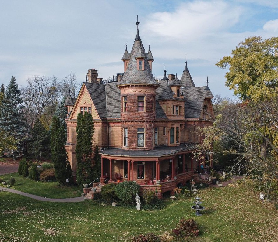 This 25-room home was constructed in a late Victorian/Queen Anne style, with seven baths and an elevator. The castle’s exterior is a combination of brick and Lake Superior sandstone. It currently boasts a rooftop hot tub, fine-dining restaurant, spa, and vineyard.